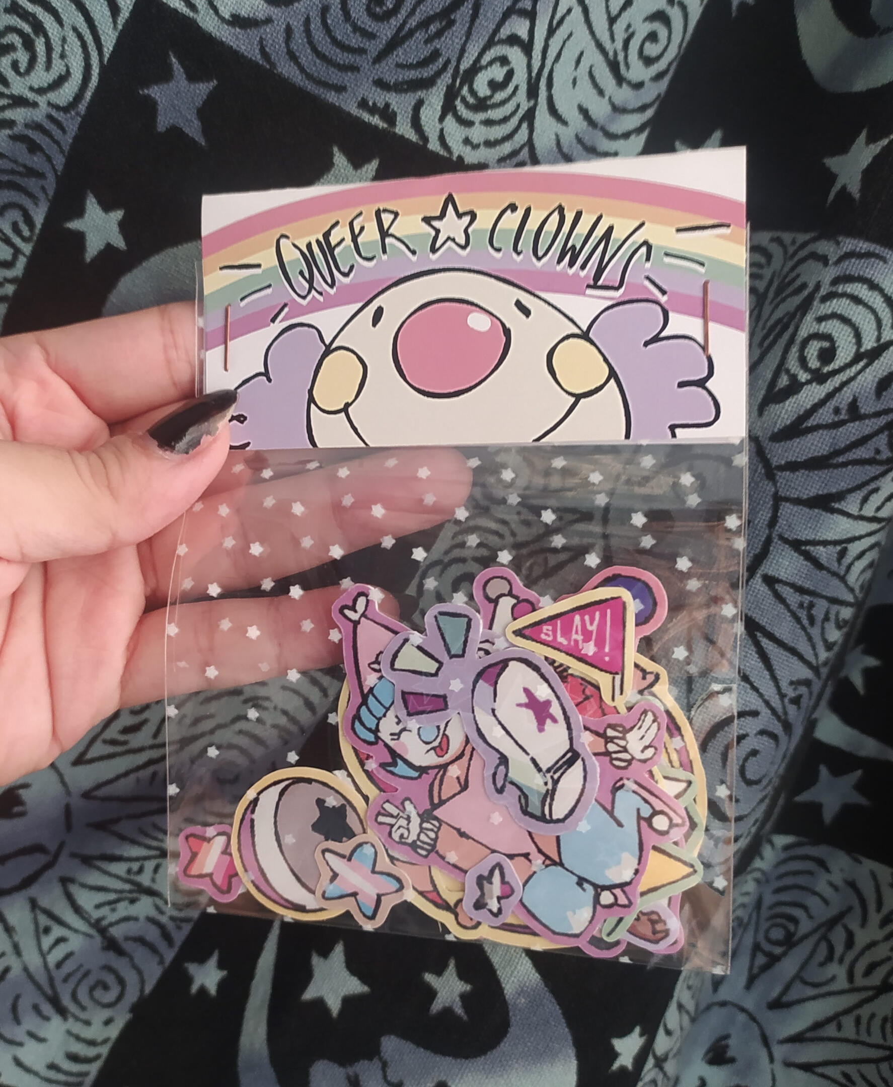 A colorful group of clows wearing their most proud colors! I wanted to make something original, eye-catching and cute to put all my knowledge to test, and my first attempt on packaging.The result was a sticker pack with 6 different clowns wearing their respective pride flags in their clothes among other funny circus-related elements.They fly but if they're available, it's in here ☆